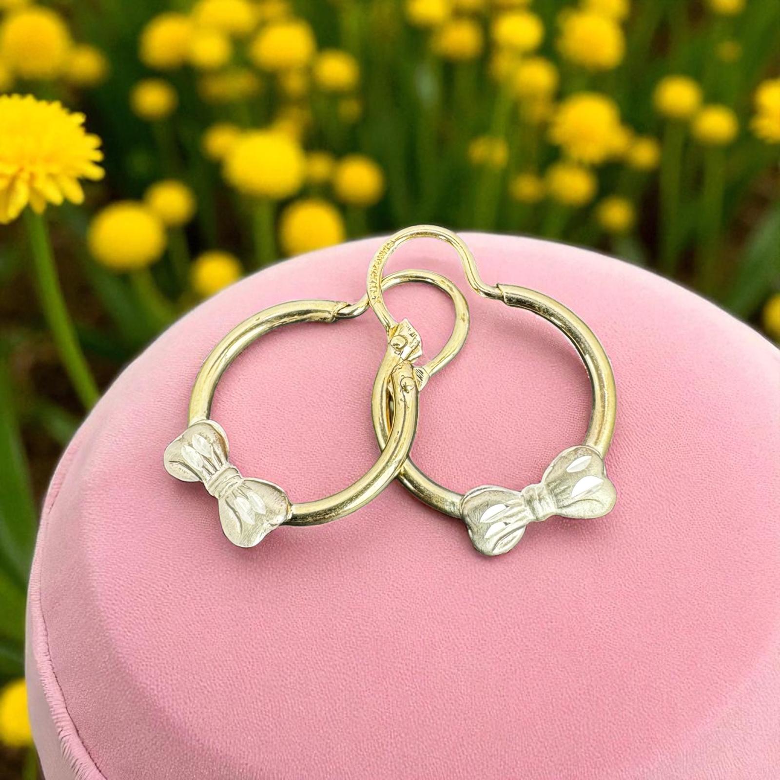 Dale a tu pequeña un toque de elegancia con esta arracada de moño y/o flor en oro mexicano 10 K. Diseñada especialmente para niñas, combina delicadeza y estilo en una joya segura y resistente.