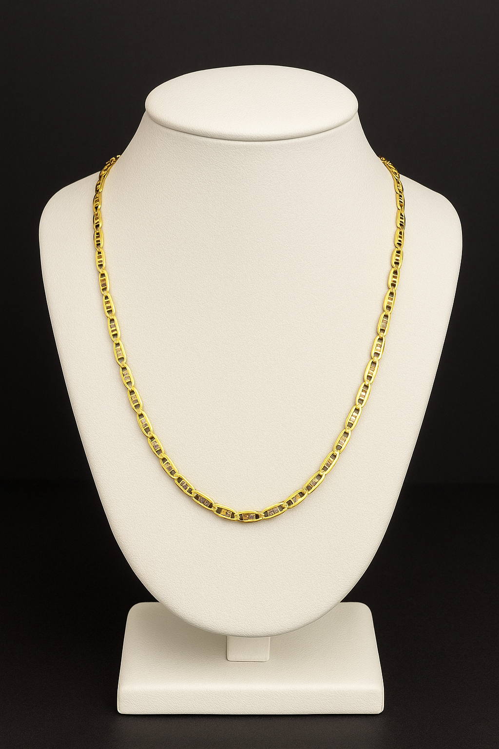 Esta cadena espejo en oro mexicano de 10 quilates combina elegancia y durabilidad, ofreciendo un brillo intenso que realza cualquier estilo.