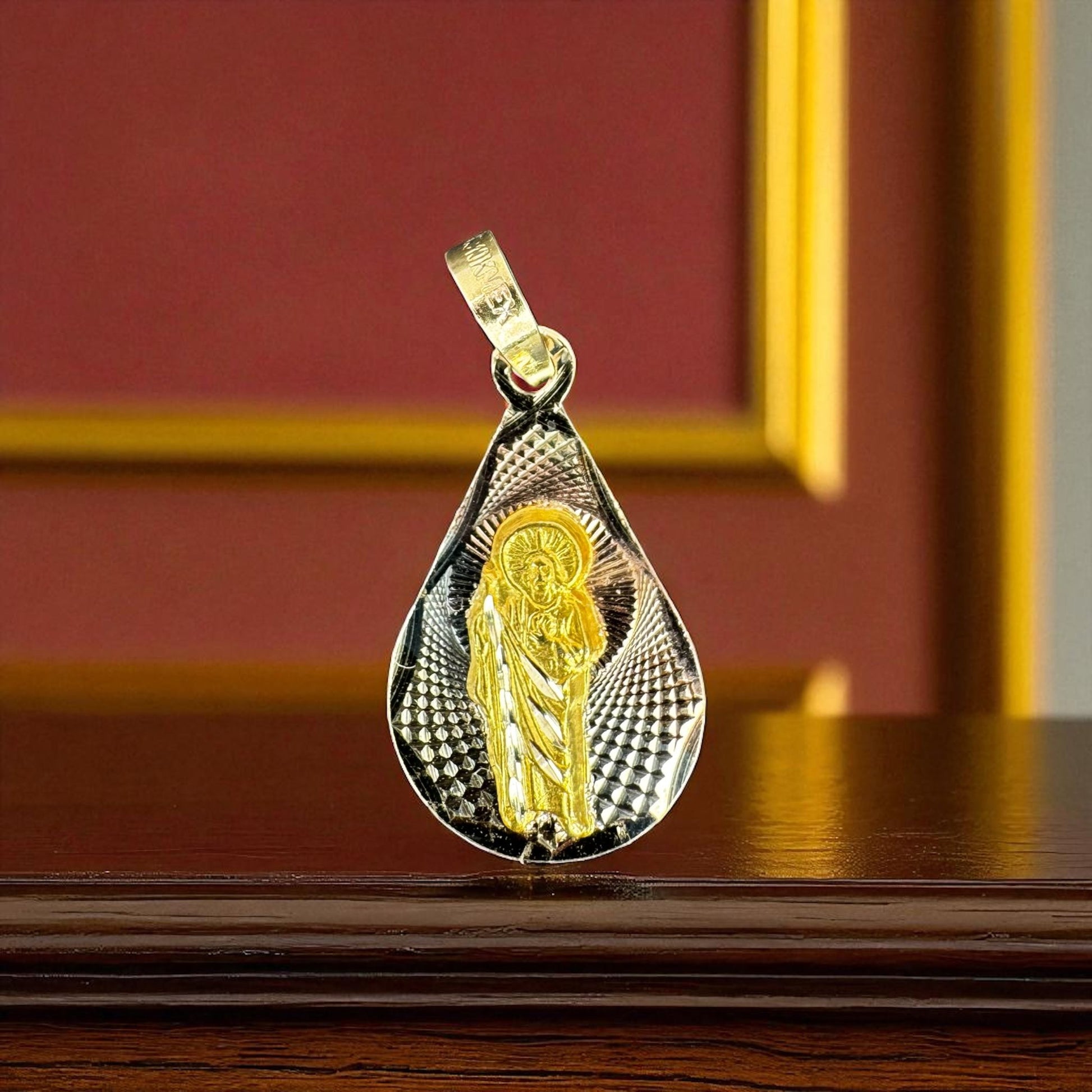 Este dije de San Judas Tadeo en forma de gota está elaborado en oro mexicano de 10 quilates, garantizando calidad y durabilidad.